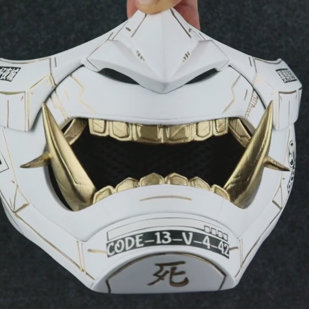 Ce masque Oni incarne la colère et la mystique du folklore japonais, revisité pour une nouvelle ère. Inspiré par des démons légendaires aux crocs acérés, ce masque fusionne le symbolisme Oni traditionnel avec une esthétique cybernétique futuriste.
