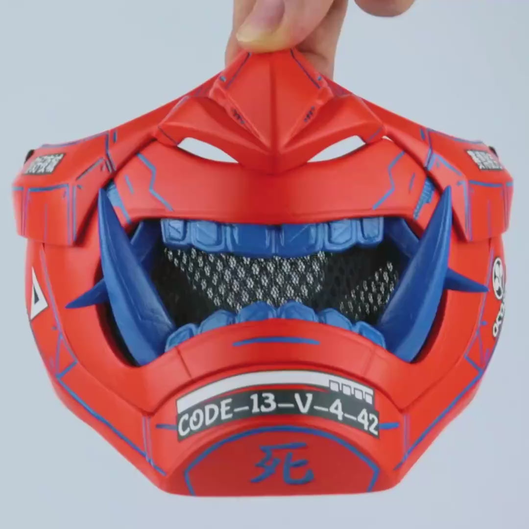 Ce masque Oni incarne la colère et la mystique du folklore japonais, revisité pour une nouvelle ère. Inspiré par des démons légendaires aux crocs acérés, ce masque fusionne le symbolisme Oni traditionnel avec une esthétique cybernétique futuriste.